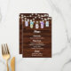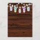 A rustic wood textured wedding menu with floral hydrangea mason jars and string of lights. This menu is part of a wedding invitation set.