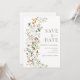 Indulge in sophistication with our refined rustic fall Save the Date invitations, featuring a delicate whimsical wreath of autumn meadow flower blooms and greenery leaves. Elevate the anticipation for your wedding with this distinctive and unique invitation.