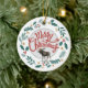A circle merry Christmas ornament with moose and a lovely hand written style script typeface. A great ornament for a cabin, home, or B&B. Red and green.