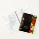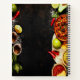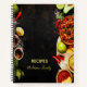 A cookbook notebook for your favorite family recipes. Mexican style food on the cove, red chili, lime, herbs, guacamole, salsa. Rustic dark wooden background. Template for your text and family yellow colored letters.