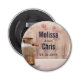 Bottle openers with a rustic country theme. An old rusting milk can with a pretty orange flower by its side. Wheat and faded red poppies in the background set against a faint wood panel. Personalise with the wedding couple's names and wedding date.