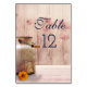 Wedding table, number cards with a rustic country theme. An old rusting milk can with a pretty orange flower by its side. Wheat and faded red poppies in the background set against a faint wood panel.