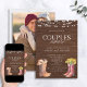 Featuring a warm wood background, this modern rustic Western engagement party invitation features string lights, a pair of his boots with his cowboy hat, and a pair of her boots with sunflowers - perfect for a casual rustic country couples shower bbq! The back of the invitation features your favourite engagement photo. Copyright Elegant Invites, all rights reserved.
