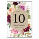 Elegant floral table number cards featuring the table number and your wedding details inside a geometric frame of watercolor roses and greenery in shades of blush pink, peach, burgundy, purple & green with a kraft paper background. Personalise by adding your names and wedding date. The design repeats on the back of the card. Designed to coordinate with our Rustic Moody Floral wedding collection.