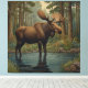 Loose yourself in the enchanting allure of this elegant bohemian moose artwork, where nature's grandeur meets timeless artistry. Set against a lush forest backdrop, this exquisite piece captures the serene beauty of a verdant woodland, rich with intricate details of flora and towering trees. The moose, standing majestically in a tranquil body of water, observes its surroundings amidst a tapestry of lush foliage, embodying the harmonious blend of botanical organic forms and nature's splendour. In the distance, the majestic mountains rise, completing the idyllic scene. Each element of the artwork, from the curling tendrils of the plants to the fine veining on the moose's antlers, is rendered with meticulous care, evoking a sense of nostalgia and wonder. This piece is a perfect homage to the elegance and intricacy of Art Nouveau design, offering a timeless window into a world where nature and art intertwine.