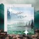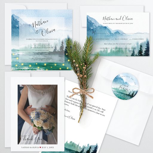 A rustic themed wedding invitation for a nature inspired ceremony with a captivating watercolor background that features a blue sky, mountains, green pine trees, and fireflies over a serene lake, invoking the magic of the outdoors. Rustic elegance that combines the charm of the wilderness with a touch of refinement, perfect for a destination wedding.