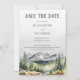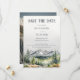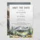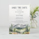 This beautiful rustic adventure begins wedding Save the Date card features watercolor painted forest mountains landscape perfect for fall, winter or destination wedding. Please replace the sample photo at the back or simply erase it to get a beautiful sage green backing.