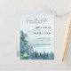Theme Parties' dark dusty blue budget-friendly save the date card (4.25 in. x 5.6 in.) design features watercolor trees and mountains set on a dark blue watercolor background. The typography pairs traditional lettering with modern hand-lettered text. #SaveTheDate #DustyBlueWedding #BudgetWedding