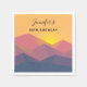 Personalised birthday paper napkins with a graphic illustration featuring many mountain tops with bright yellow sunlight setting behind the mountains. Made with geometric polygonal shapes.Simple minimalist design. Colours range from dark blue to desert red.