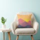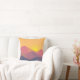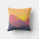 A pillow with a graphic illustration featuring many mountain tops with bright yellow sunlight setting behind the mountains. Made with geometric polygonal shapes.Simple minimalist design. Colours range from dark blue to desert red.
