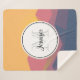 A sherpa banket with a graphic illustration featuring many mountain tops with bright yellow sunlight setting behind the mountains. Made with geometric polygonal shapes.Simple minimalist design. Colours range from dark blue to desert red. A white circle layered over top with your monogram initial and name inside.