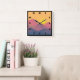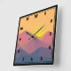 A clock with a graphic illustration featuring many mountain tops with bright yellow sunlight setting behind the mountains. Made with geometric polygonal shapes.Simple minimalist design. Colours range from dark blue to desert red.