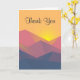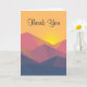 Thank you card with a graphic illustration featuring many mountain tops with bright yellow sunlight setting behind the mountains. Made with geometric polygonal shapes.Simple minimalist design. Colours range from dark blue to desert red.