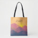 Tote bag with a graphic illustration featuring many mountain tops with bright yellow sunlight setting behind the mountains. Made with geometric polygonal shapes.Simple minimalist design. Colours range from dark blue to desert red.