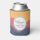 A Wedding welcome can cooler designed with a graphic illustration featuring many mountain tops with bright yellow sunlight setting behind the mountains. Made with geometric polygonal shapes.Simple minimalist design. Colours range from dark blue to desert red.