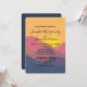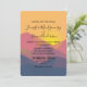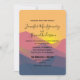 Wedding invitation with a graphic illustration featuring many mountain tops with bright yellow sunlight peaking out from behind. Made with geometric polygonal shapes.