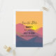 Save the date birthday / event postcard with a graphic illustration featuring many mountain tops with bright yellow sunlight setting behind the mountains. Made with geometric polygonal shapes.Simple minimalist design. Colours range from dark blue to desert red.