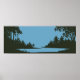 A graphic landscape wall art including a rustic nature scene with body of water in black and blue colours. Perfect for home or office decoration.