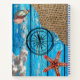 A rustic background texture of blue wood, faux burlap, orange starfish, seashell, white coral and compass centred with custom text. A nautical design with a modern twist. Customise the text and make it your own.