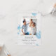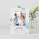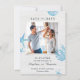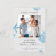 This trendy Save the Date has a nautical or beach theme. It features a white wood background for a rustic look. Watercolor style drawing of seashell, starfish, and coral decorate the design. A picture of the couple is at the centre. This card is perfect for a beach wedding, summer wedding, rustic wedding, or destination wedding. The look is fresh, airy and cosy.