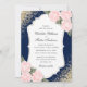 Elegant rustic navy blue and blush wedding invitation featuring baby's breath and blush pink roses on a navy blue burlap background. Perfect card design for inviting your guests to your navy blue and blush rustic wedding party. Matching items available.