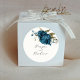 Rustic floral theme favour sticker featuring watercolor illustration of purple navy blue flowers with greenery.