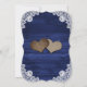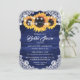 Elegant rustic navy blue and sunflower bridal shower invitation featuring sunflower flowers, burlap hearts, delicate floral lace and string lights against a rustic wood background. Matching items available.