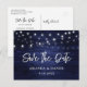 Rustic navy blue wedding save the date postcard featuring rustic wood adorned with string lights.