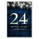 Rustic table card with a navy wood background featuring string lights. The font colours and font styles on the table card design are all fully customisable.