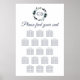 Elegant navy wedding table plan featuring a classic white background that can be changed to any colour, rustic boho blue watercolor floral wreath with your initials, and a modern wedding seating chart template of 17 tables.