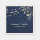 Elegant navy blue wedding napkins featuring a rustic wood texture, delicate gold floral sketch, and glowing string lights. Personalised with the couple’s names and date, these soft napkins add charm to any winter or evening celebration. A beautiful finishing touch for your wedding reception, cocktail hour, or dinner setting.