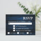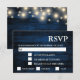 Rustic wedding RSVP card with a navy blue wood background with string lights. The date to RSVP by has a labelled text box to help you customise it for your day.