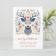 Rustic Nordic Scandi style Christmas card, featuring a decorated reindeer surrounded by foliage in hues of blue and rust. Merry Christmas in script typography. Add your own verse and names. Available in print, as a digital download, or both!