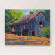 Rustic old barn on a Augusta, Missouri farm with background trees painted in rich oil painting colours of purples, blues, oranges, and greens. Designed from an original impressionistic oil painting by fine art painter Daniel Fishback.