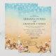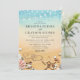Tropical beach destination wedding invitations featuring a rustic ombre yellow to watercolor blue background, starfish, seashells, string lights, two hearts in the sand with your initials, and an elegant wedding template that is easy to personalise.