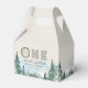 This favour box features watercolor mountains and forest scenery. the "one" is a wood circle and green plaid. It is the perfect way to thank guests for coming to your little one's party.