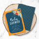Baby Shower invitation featuring flowers and leaves against orange and blue background with a slightly distressed effect for a rustic look on the front, perfect for an autumn event. Invitation has an orange polka dot pattern against blue background with a slightly distressed effect for a rustic look on the back side.