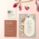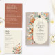 A unique design for a unique couple. The design features delicate flowers illustration in burnt orange and white with some greenery over a taupe background, great for summer or early fall wedding.