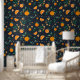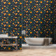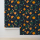 Accent your walls with this rich citrus patterned wallpaper. It features vibrant oranges and orange blossoms with leafy foliage dancing over a dark deep navy blue background.