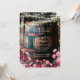 This charming rustic whiskey barrel serves as a unique wedding décor piece, featuring a weathered, aged appearance that exudes vintage elegance. Resting on a wooden platform, the barrel is topped with a sturdy lid, perfect for use as a decorative accent or functional display. A warm string of lights wrapped around a wooden post softly illuminates the dark background, creating an inviting ambiance. Delicate pink and burgundy florals frame the bottom of the scene, adding a romantic and sophisticated touch, making it an ideal setting for a rustic, barn, or country-style wedding.