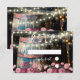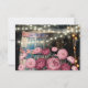 This charming rustic whiskey barrel serves as a unique wedding décor piece, featuring a weathered, aged appearance that exudes vintage elegance. Resting on a wooden platform, the barrel is topped with a sturdy lid, perfect for use as a decorative accent or functional display. A warm string of lights wrapped around a wooden post softly illuminates the dark background, creating an inviting ambiance. Delicate pink and burgundy florals frame the bottom of the scene, adding a romantic and sophisticated touch, making it an ideal setting for a rustic, barn, or country-style wedding.