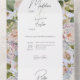 ALSO AVAILABLE WITH A QR CODE TO SCAN IN THE RSVP AREA OR WITHOUT DINNER SELECTION OPTIONS. This simple but elegant wedding invitation design features a beautiful hydrangea floral background of dusty pink, soft periwinkle blues and purples with greenery. The text is displayed on an arched white background. Created by Simply Farmhouse Press.