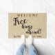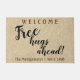 Welcome your guests with this fun script typography rustic door mat design "Free hugs ahead" personalised with a name and year plus WELCOME at the top. Fill in the text field with a family name, remove the name or click customise to select a font style, size, and colour you prefer.