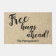 Welcome your guests with this fun script typography rustic door mat design personalised with a name and "Free hugs ahead" message. Fill in the text field with a family name, remove the name or click customise to select a font style, size, and colour you prefer.