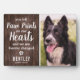Personalised pet memorial plaque featuring a photo of your beloved pet, a rustic wooden background, and a sympathy quote that reads "you left paw prints on our hearts and we are forever changed", a paw print, heart, your dogs name, and the dates. A wonderful keepsake and tribute of your precious family pet dog or cat.