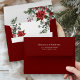 Elegant wedding envelope featuring beautiful red poinsettia flowers with pine cones and leaves.