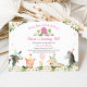 This cute birthday invitation features watercolor farm animals with pink floral accents, confetti and a pink gingham border.