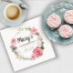 Soft blush pink roses and bright pink buds create a beautifully rustic floral wreath. White hydrangeas at to the floral bloom. The birthday woman's name is written in a large script font. 100th Birthday and the thank you sentiment follow. This birthday napkin is part of the 100th Birthday Bella Rose collection. It contains many DIY templates that let you quickly create invitations and party supplies.