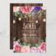 Rustic wood, pink and purple flowers with greenery, and sparkling string lights and lanterns 50th country-style birthday party invitation for women. Contact us for help with customisation or to request matching products.