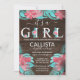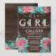 This modern and rustic baby shower invitation is perfect for a trendy and stylish country event. It features hand-drawn light pink and dark pink flowers and teal green leaves overlayed on top of brown barn wood planks with the cute quote, "It's a girl," with floral decorative typography. It's pretty, elegant, and unique.
